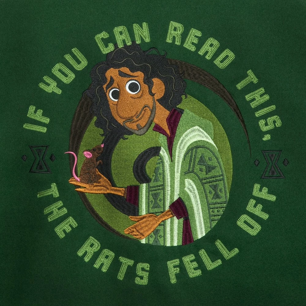 - Grand motif Bruno brodé dans le dos avec inscription « If you can read this, the rats fell off » (Si vous parvenez à lire ce message, c’est que les rats sont tombés)