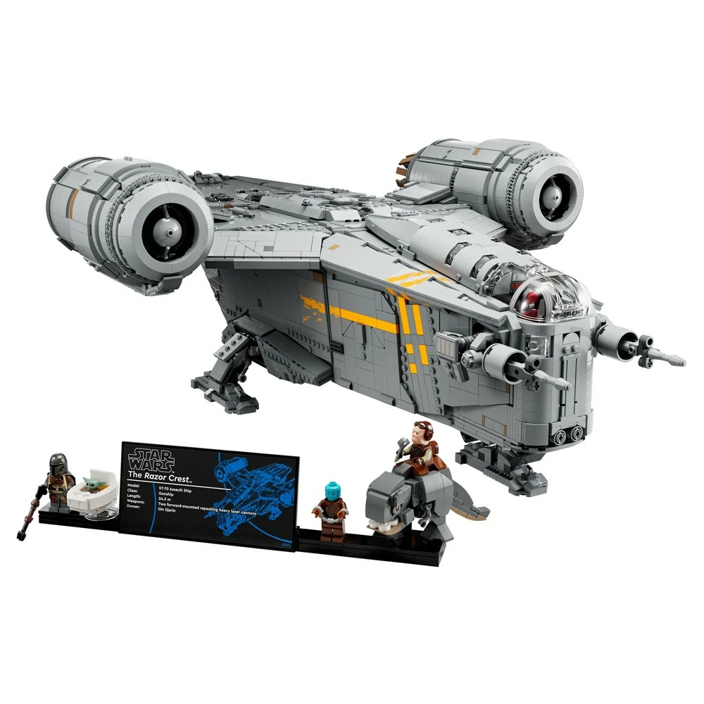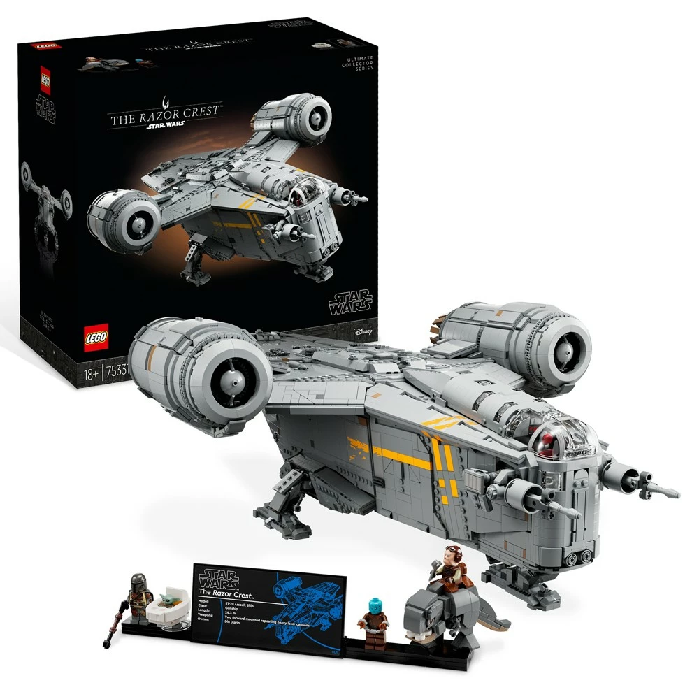 Revivez les aventures de The Mandalorian en construisant cette version Ultimate Collector Series du Razor Crest. Ce modèle reproduit fidèlement le cockpit, les dortoirs, les trappes latérales, le compartiment cargo et la chambre de congélation carbonique. Cette construction impressionnante est complétée par un présentoir pour les minifigures LEGO du Mandalorien, de Mythrol et de Kuiil ainsi que les figurines LEGO de Grogu et de Blurrg.