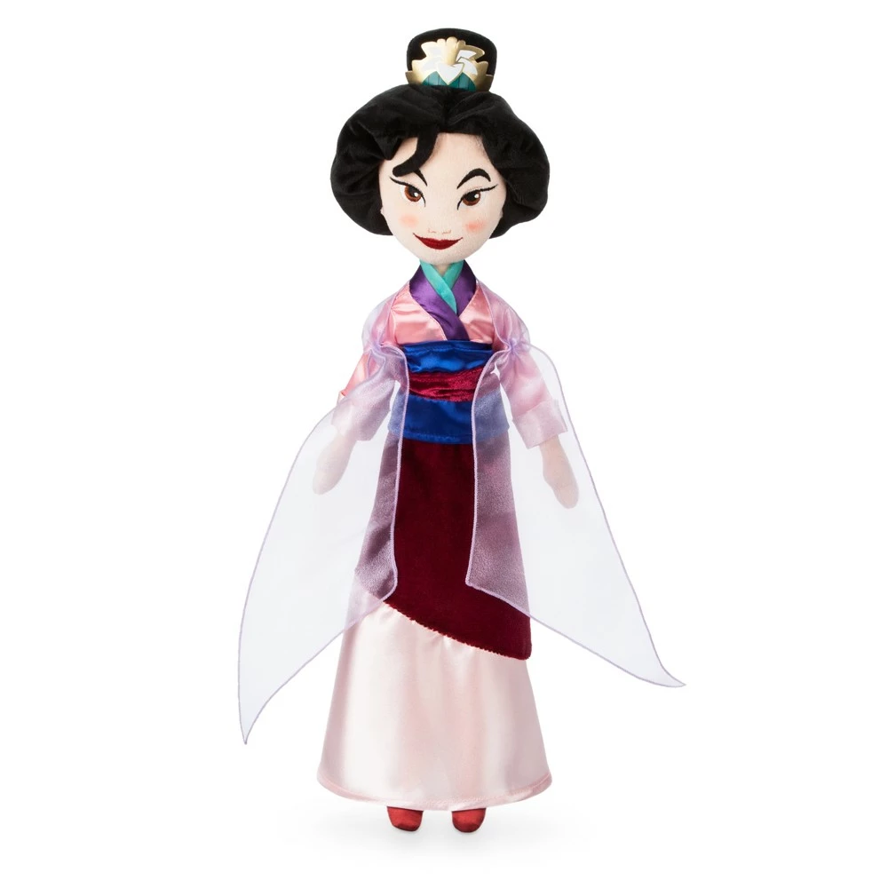 Comment avez-vous pu vous passer aussi longtemps de la princesse guerrière ? Bravoure et honneur sont au rendez-vous ! Cette peluche propose de retrouver Mulan dans une robe en satin rehaussée de jolis empiècements de velours, le tout agrémenté d’un châle en organza.